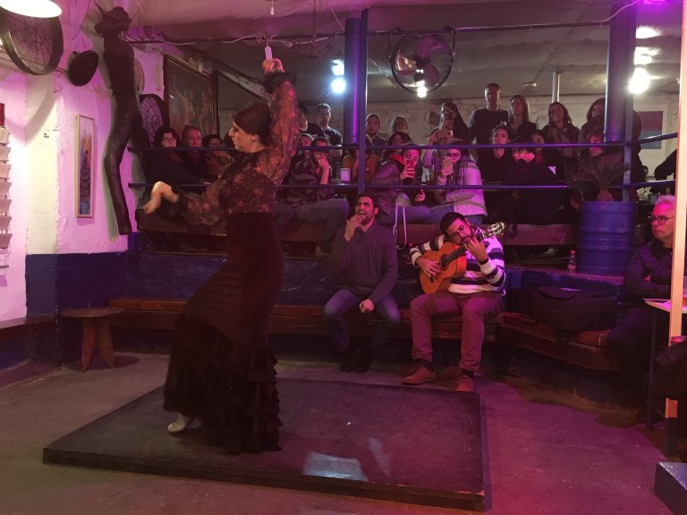 在塞維亞La Carbonería酒館(Google地圖上標示為「煤廠」),只要點一杯酒,就可以免費觀賞佛朗明哥表演!每天共有三場表演,分別是9:30、10:30、11:30,當天我們留下來把三場都看完,三場表演都有些許不一樣,越晚越精彩!建議想來的人提早過來,才能卡在離舞台比較近的好位置喔!