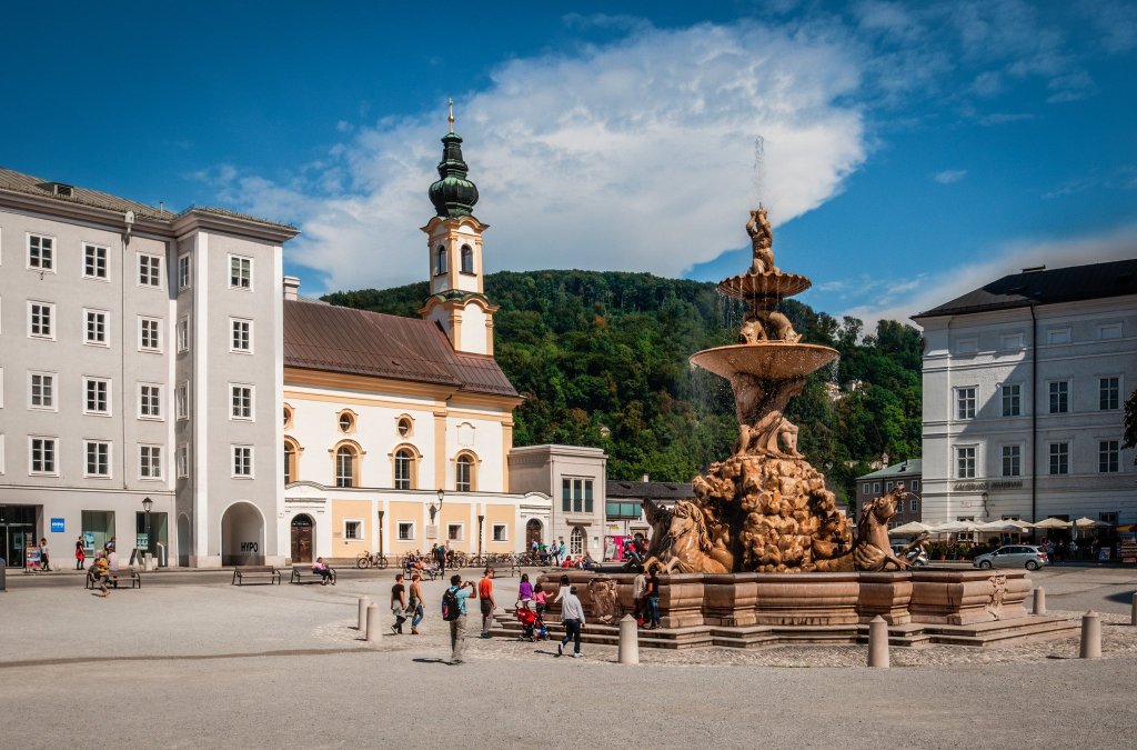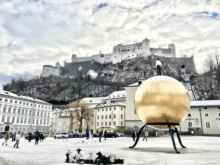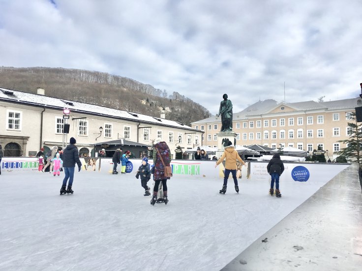 莫札特廣場位於薩爾斯堡大教堂的另一方,冬季的時候會整理為溜冰場,作為薩爾斯堡居民娛樂空間。廣場中間有一座莫札特的雕像,莫札特應該沒有想過自己有朝一日會成為溜冰場管理員哈哈!