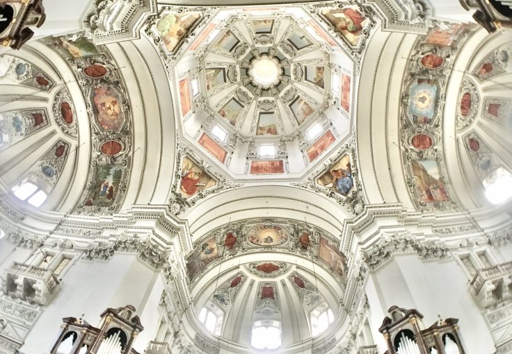 主教堂不僅是外觀吸睛,教堂內部也相當華麗。薩爾斯堡主教堂內的圓形穹頂上的雕刻和壁畫都展現出不同的意象,如果有入內參觀,別忘了抬起頭欣賞一下壯觀的壁畫喔!