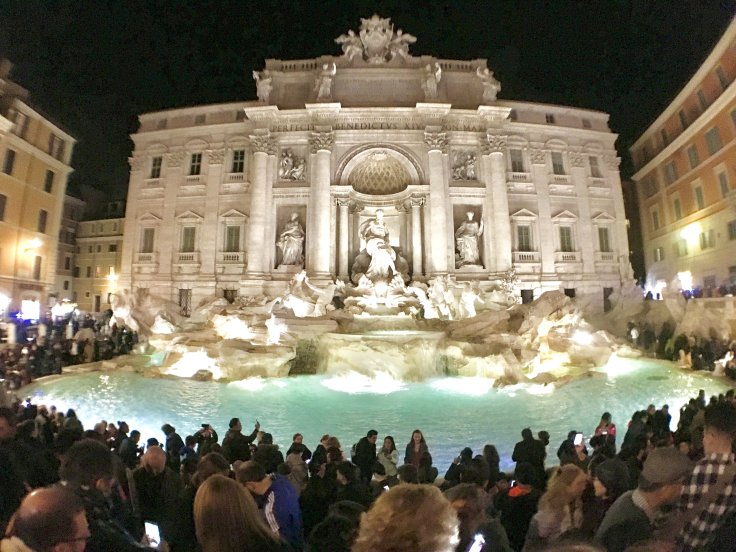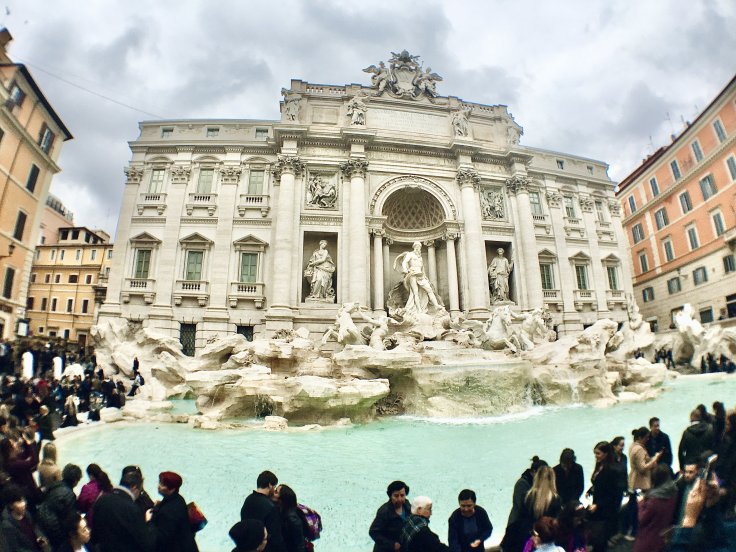 如果你覺得西班牙階梯的人潮很驚人,那只能跟你說聲抱歉了,特雷維噴泉只會加倍可怕哈哈!特雷維噴泉就是大家熟知的羅馬許願池,許願池雕刻是以海神作為主軸,海神前方有兩匹馬,左邊的馬桀敖不馴,右邊的馬則是乖巧溫馴,分別代表海洋波濤洶湧及無風無浪的兩種樣貌。