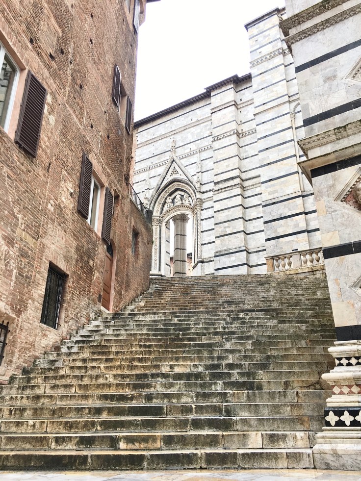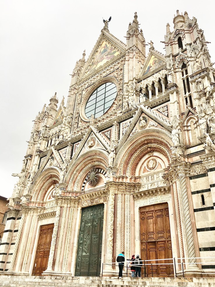 黑白相間的斑馬教堂,是西恩納最出名的地標,也是我一開始決定把西恩納排進行程的主因!西恩納教堂建於12世紀,主體和佛羅倫斯百花大教堂一樣,是由白色、紅色、綠色這三種顏色的大理石所組成。其實托斯卡尼地區很多教堂的設計,都是以這三種顏色的大理石構成,原因是這些的大理石分別來自托斯卡尼省的不同城市,分別象徵著愛、信念跟希望這三個元素。