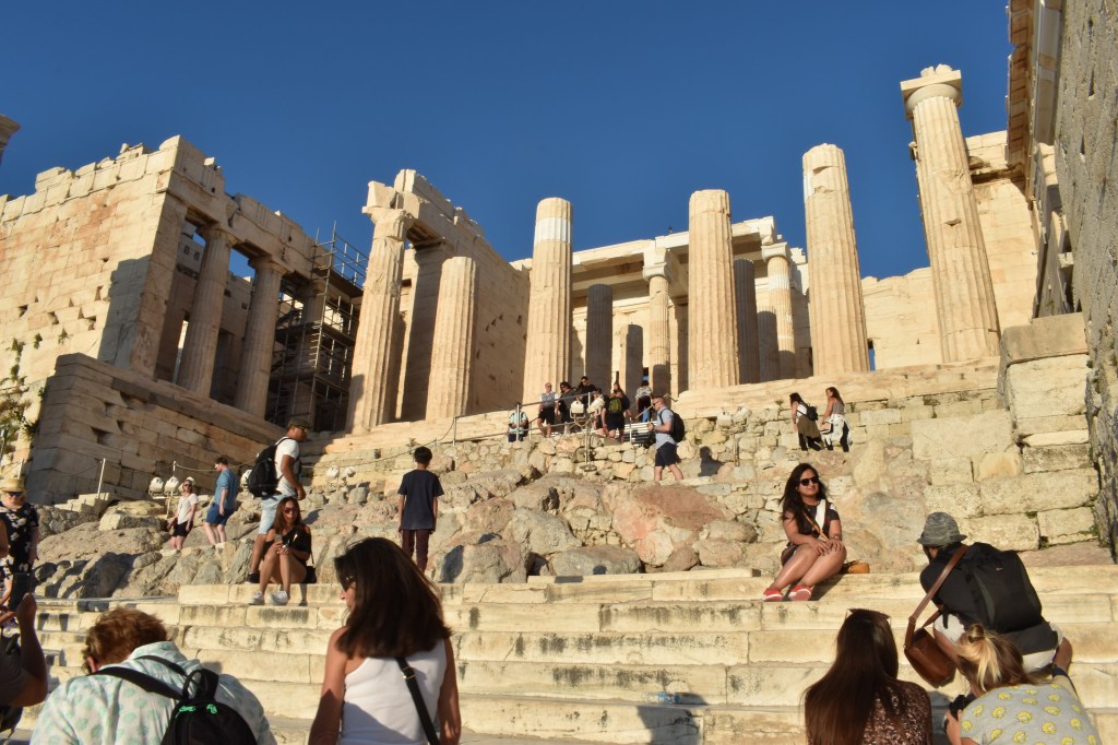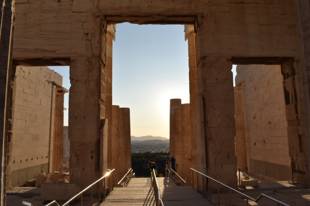 從山門往外看可以看到雅典市景,不少人坐在這邊的階梯上欣賞風景。需要特別提醒的是這邊的階梯都是大理石,非常滑!當天天氣很好,還是覺得走起路來有點可怕,提醒大家要穿比較防滑的鞋子,如果遇到雨天更要留意腳步。
