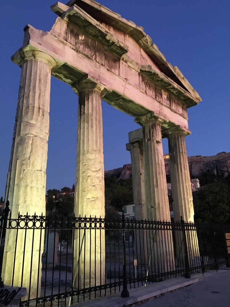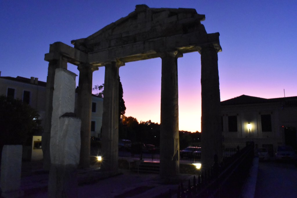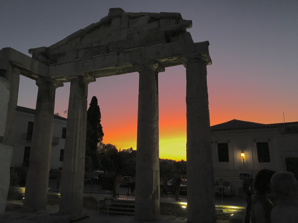 在哈德良圖書館周邊散步的時候,我們看見橘黃色和紫色天空,很美很夢幻。圖書館旁的Adrianou有很多餐廳咖啡館、紀念品小店可以逛,氛圍愜意逛起來非常舒服。