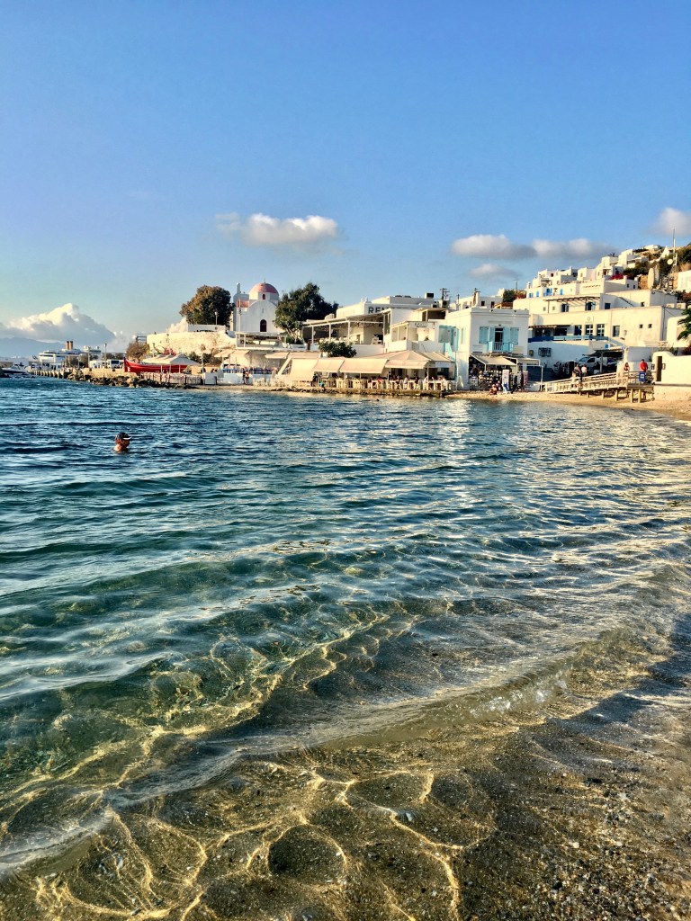 從奶油教堂繼續往北走,繞過舊港之後會來到米克諾斯沙灘。米克諾斯沙灘的海水非常清澈,水深也很友善,如果沒時間去天堂海灘,又想玩水的話,可以將米克諾斯沙灘排進行程!