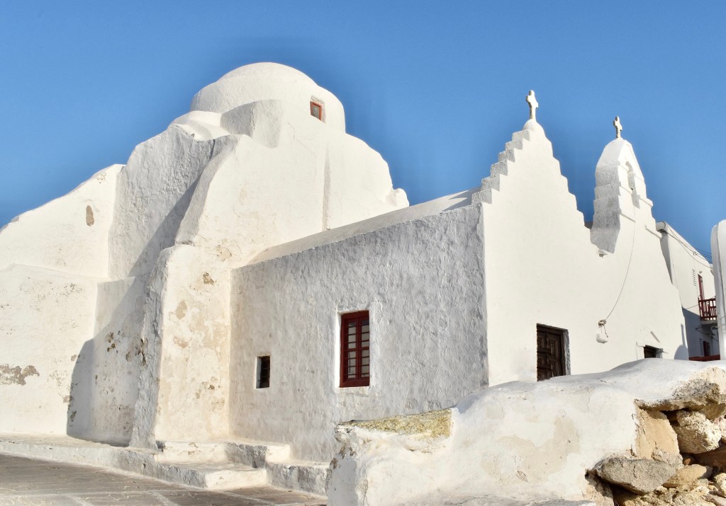 在Kastro’s Restaurant旁,還有一座熱門打卡教堂—帕拉波爾提亞尼教堂,這座教堂純白外表加上看起來像融化的曲線,讓它擁有「奶油教堂」、「棉花糖教堂」的可愛稱號,超級夢幻~有來米克諾斯的話,一定要拍下它可愛的模樣!