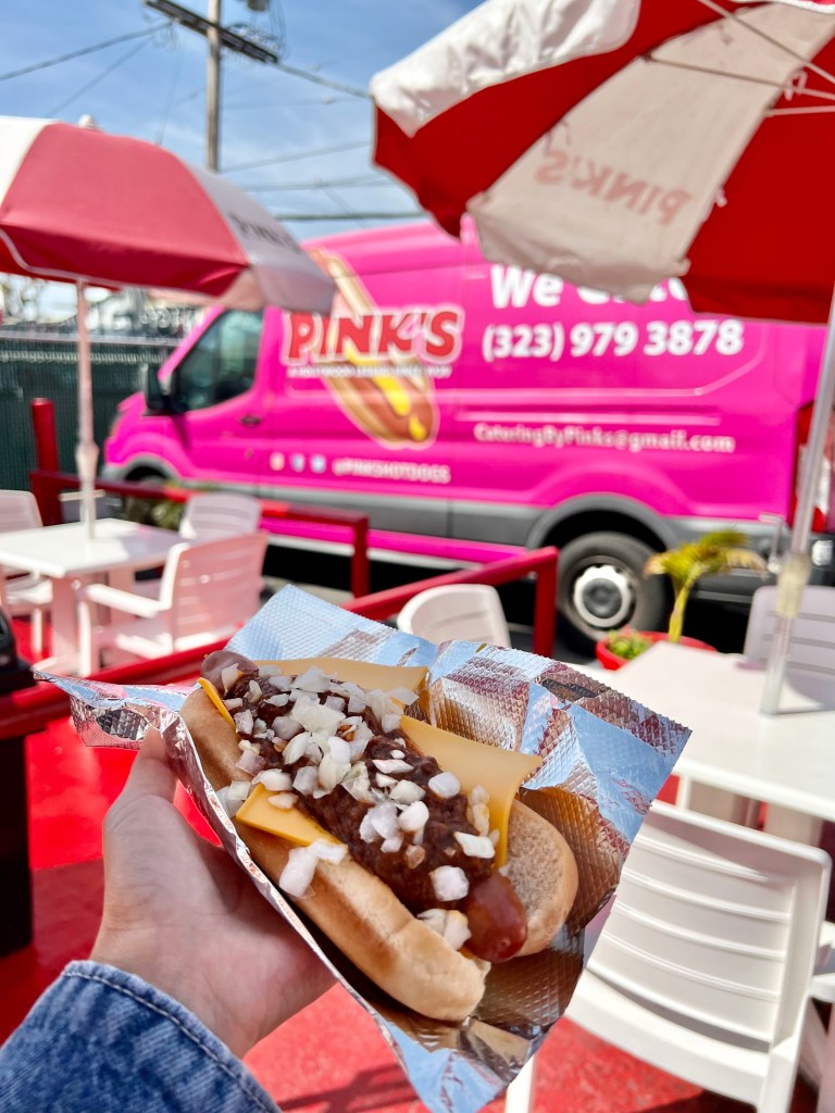 粉紅熱狗是洛杉磯人人皆知的80年老店,搜尋洛杉磯美食也絕對會出現粉紅熱狗。粉紅熱狗從1939年小攤販起家,100%牛肉製成的傳統美式熱狗,搭配鬆軟麵包,再加上各種配料變化出約30種口味,選擇多到讓人點餐出現選擇障礙,快來試試看哪個口味最適合你吧!