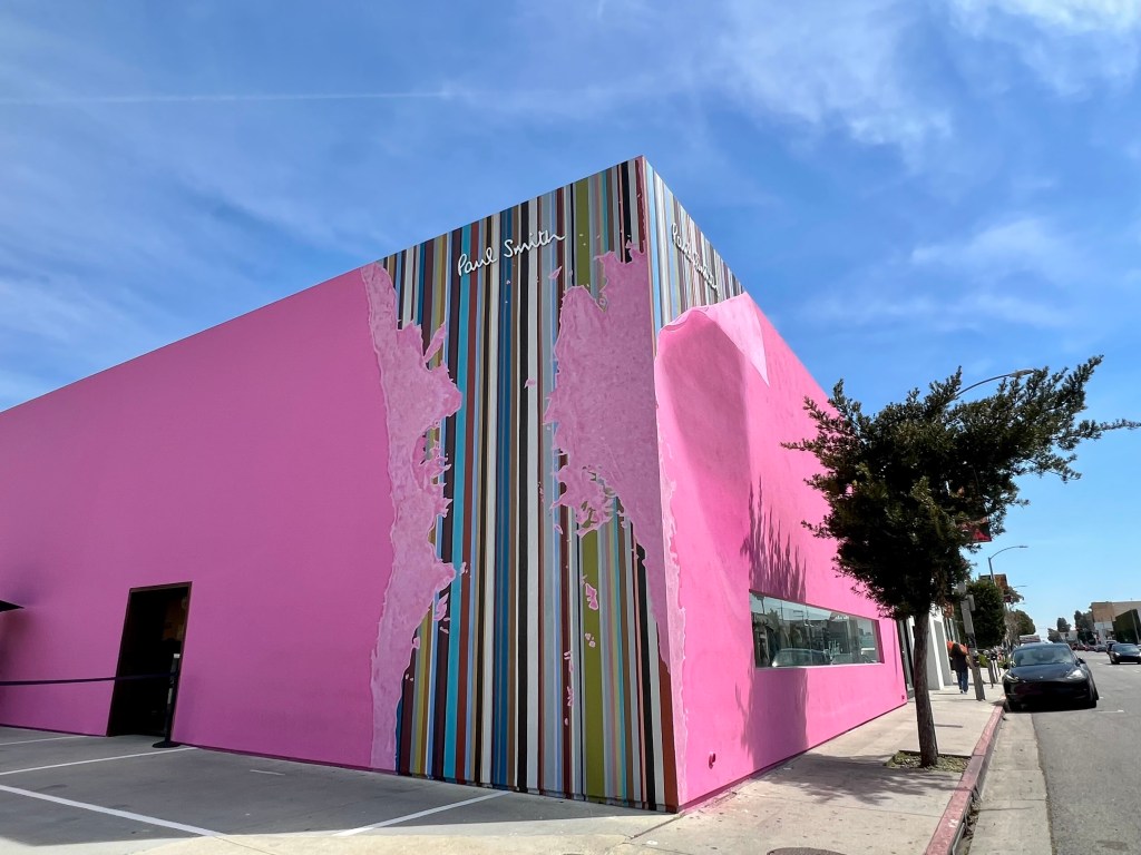 既然提到洛杉磯網美景點,就不能漏掉洛杉磯的粉紅牆。洛杉磯粉紅牆是英國時尚品牌PAUL SMITH 的旗艦店外牆,原本整面牆都是粉紅色,2022年PAUL SMITH將經典的彩虹條紋融入牆面,營造出3D視覺效果,個人覺得現在的版本比之前更好看,更值得打卡!