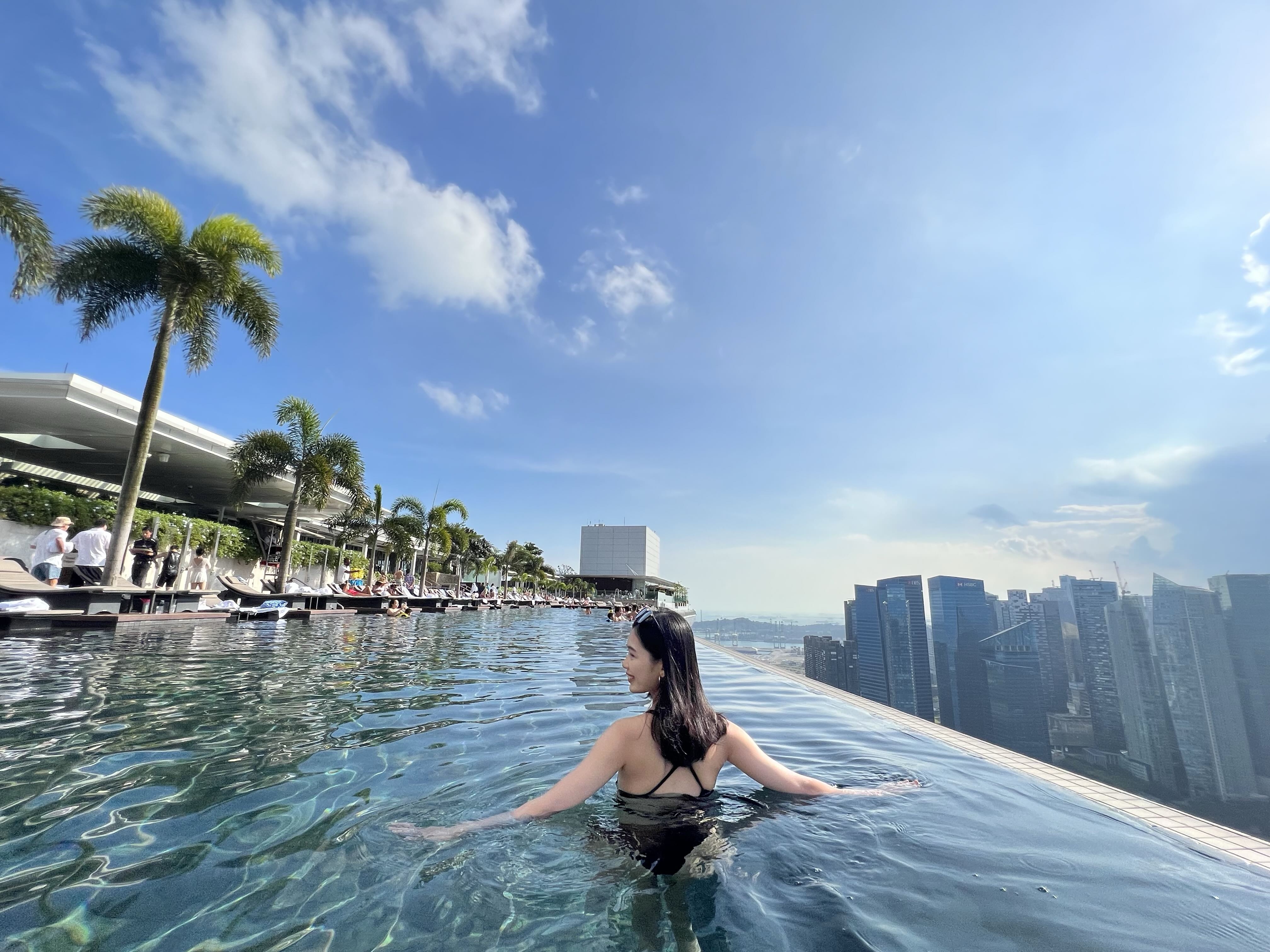 金沙酒店頂樓的無邊際泳池是目前全世界最高且最大的屋頂泳池,大部分房客都是衝著泳池而來,view真的非常厲害!這次住的是面對濱海灣花園的房型,陽台視野也超好!